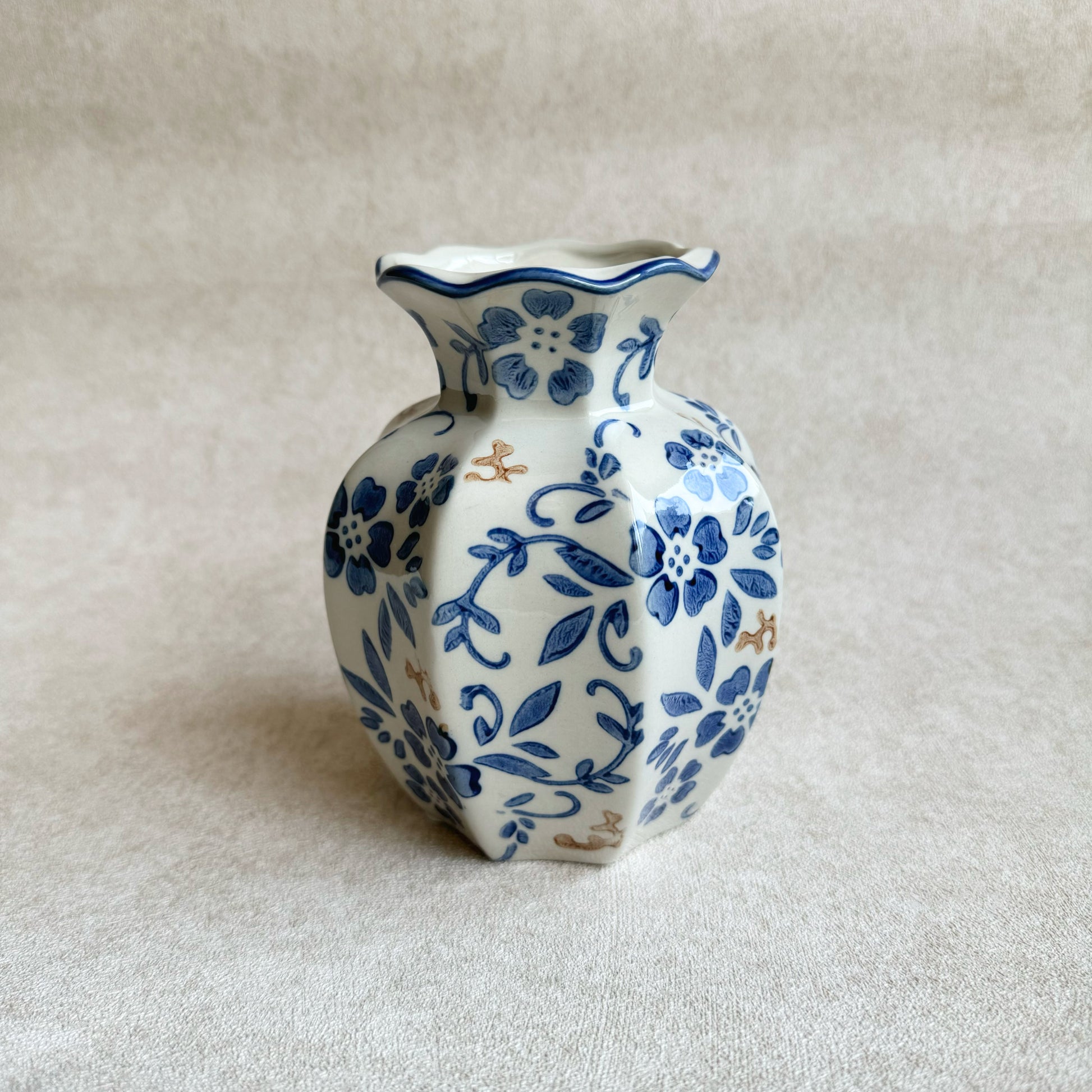 Introducing our exquisite Porcelain Flower Vase, a timeless piece that combines elegance and craftsmanship. This beautiful vase features a delicate floral pattern in classic blue and white, adorned with subtle golden accents that enhance its sophisticated charm.