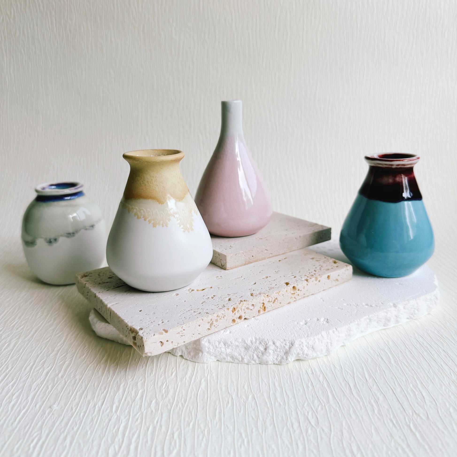 This exquisite set of mini ceramic vases captures the essence of the four seasons, each piece showcasing a unique color and texture. The vase with intertwined white and golden hues resembles the warm sun of spring, the pale pink vase evokes the roses of summer, the deep blue and brown vase brings to mind the autumn night sky, and the light icy blue vase offers the coolness of winter.