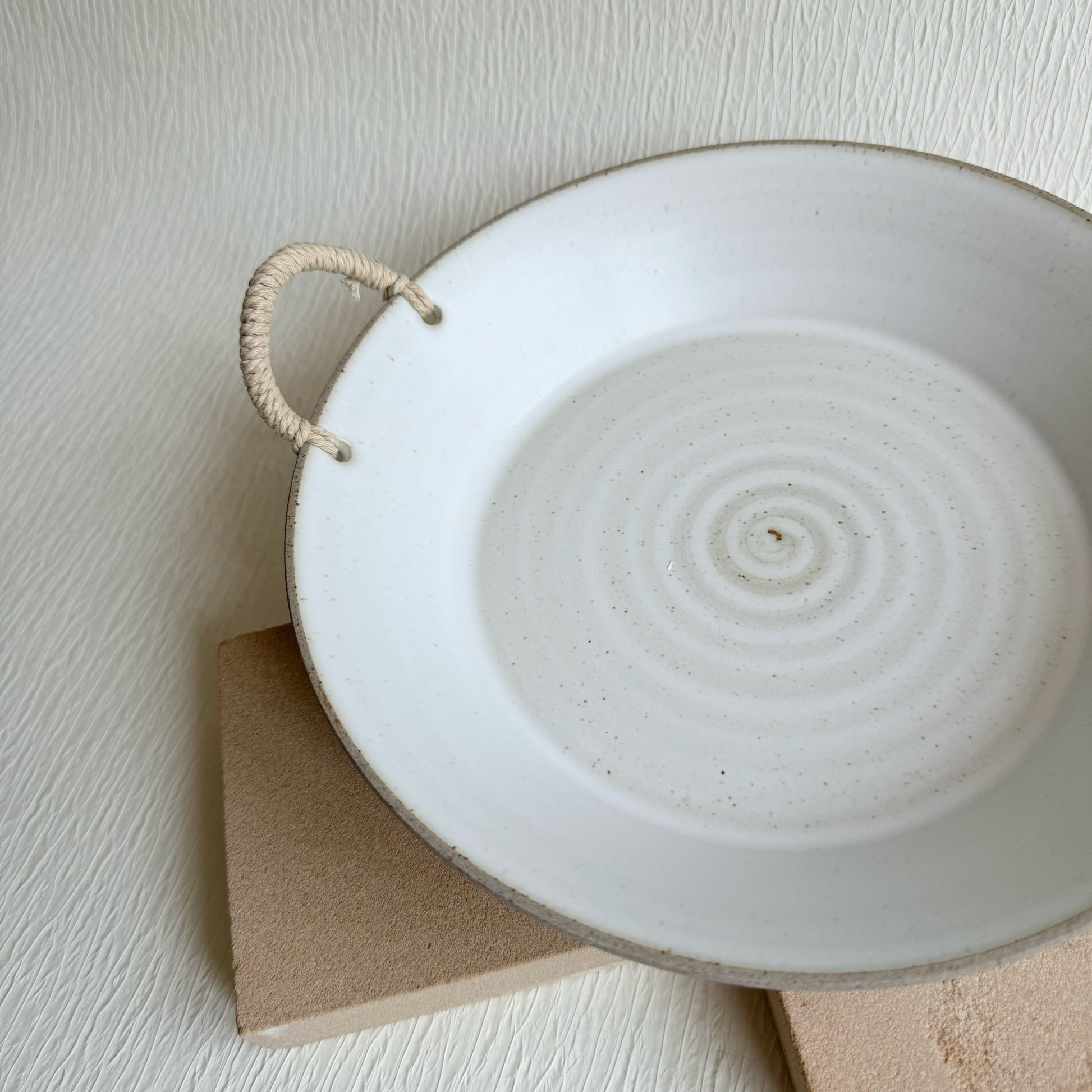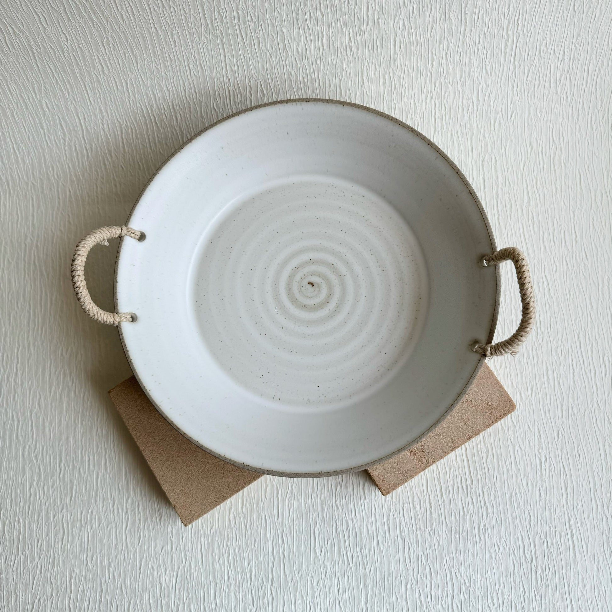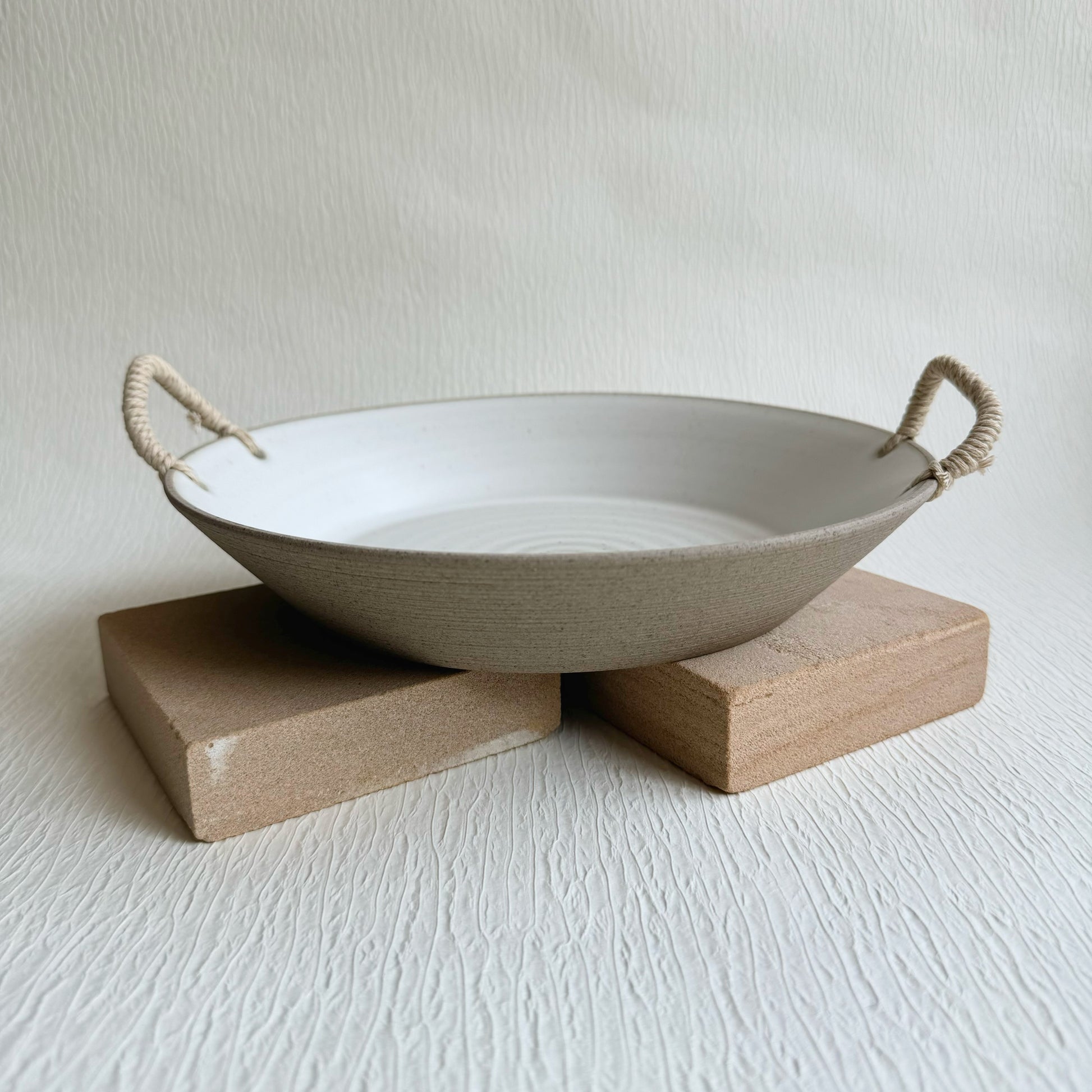 Introducing our rustic ceramic double-handles bowl, a beautifully crafted piece that combines functionality with rustic charm. This bowl is made from natural stoneware, featuring a raw, earthy exterior and a smooth, white glazed interior. The bowl's unique design includes two sturdy handles made in jute rope, adding both aesthetic appeal and practical convenience.